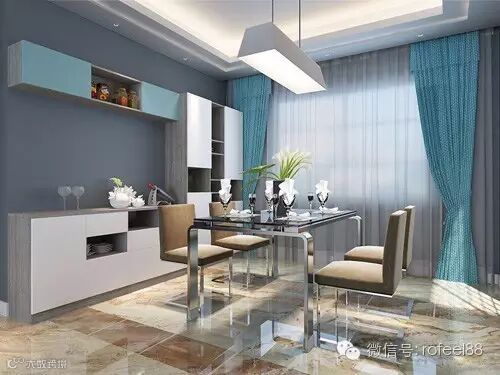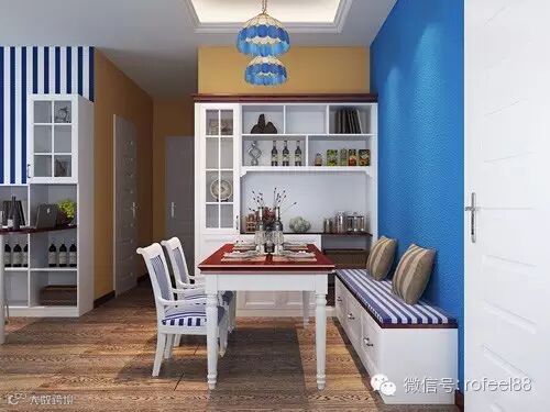 蓝白是客餐厅的主色调,在视觉上先给人明亮自然的感觉。餐厅设计了卡座,代替了餐椅,这是餐厅的一大亮点。卡座下面的单元柜可储物,增强了餐厅的收纳功能。