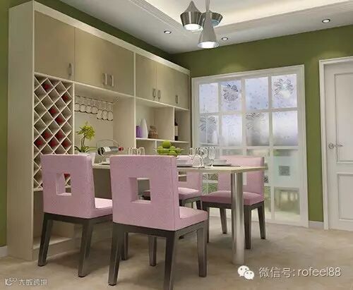 在餐厅设计中,我们可以大胆地摒弃常规的餐桌设计,用餐边组合柜和餐区餐桌一体拼接,既显得整洁大气,又节省了空间。酒柜有菱形酒格和酒杯架,方便存放多种酒类,诠释一种现代时尚的情调生活。