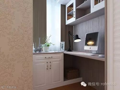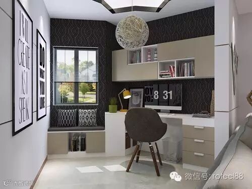 装修客厅角落,定制书桌与吊柜的组合,灰色的门板,白色的柜身,颜色搭配于墙面比之色形成鲜明比对,窗户底下加个榻榻米地柜的设计,使得严肃的办公区瞬间多了休闲的气息,打造当下时尚的SOHO区,在家也能很精彩。