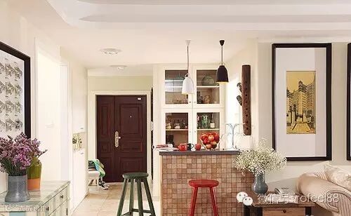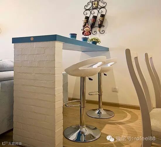 小方格铺贴是田园风格中常见的设计方案,将这样的设计用在吧台上,给原本简约的家装风格点缀得温馨时尚。