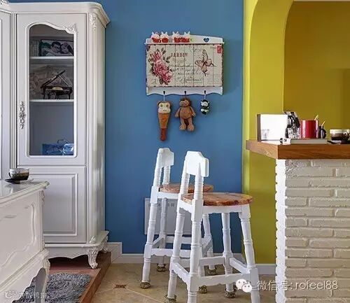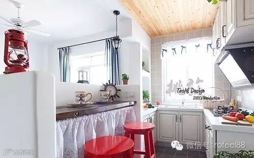厨房做的小吧台,巧妙的白色半帘设计让吧台俏皮了不少,上面有可爱的蓝色蝴蝶结。