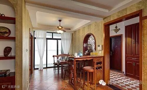 过了玄关就是餐厅,边上有个小吧台,与整体家装风格统一的独特吧台设计,和谐实用。