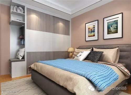 用一面墙设计整体衣柜加入电视柜单元,可以省去了电视背景墙,更节约了卧室空间,简单实用!