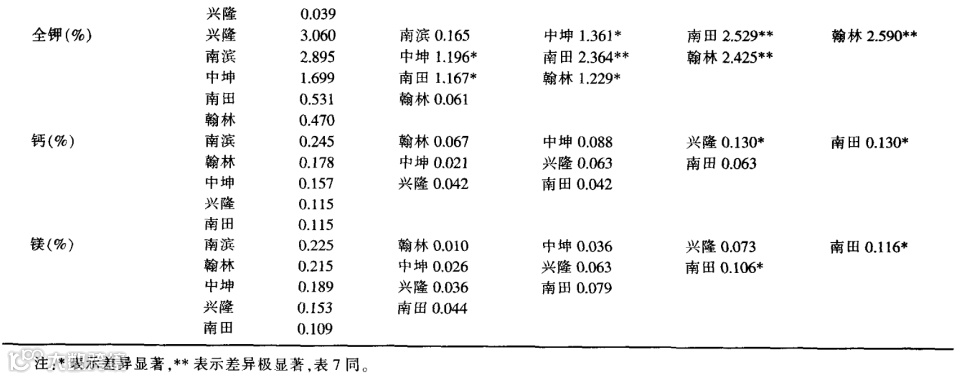 全钾含量地区比较:兴隆样区显著地大于中坤样区,极显著地大于南田和翰林样区,南滨样区显著地大于中坤样区,极显著地大于南田和翰林样区,中坤样区也显著地大于南田和翰林样区。