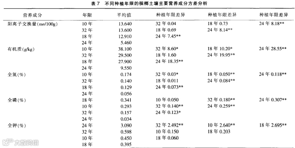 由表7可知,槟榔土壤营养成分种植年限间差异十分显著。
