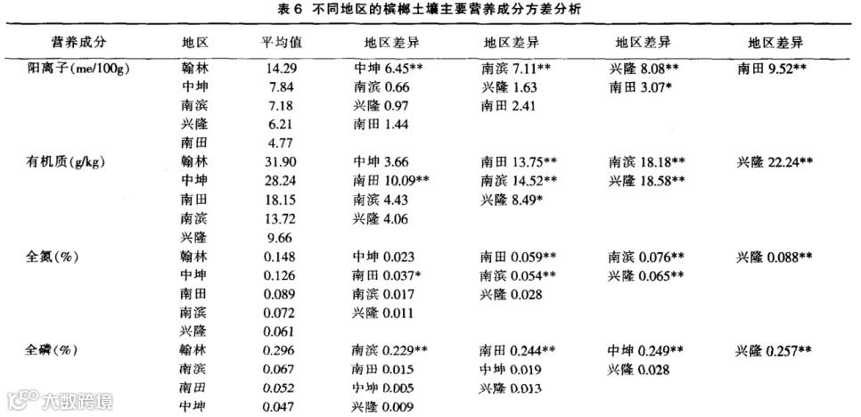 由表6可知,槟榔土壤营养成分地区问差异十分显著。