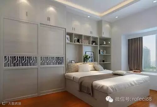 狭长的卧室中,如果一侧墙面有窗子或者门遮挡,不适宜摆放衣柜,那么可以在床头那面墙定做安装组合衣柜。很多人愿意在床头正上方加装顶柜,这样也会对睡眠不利,最好能增加床头板的厚度,使人躺下时,眼睛平视能看到天花,通透感和安全感更强。