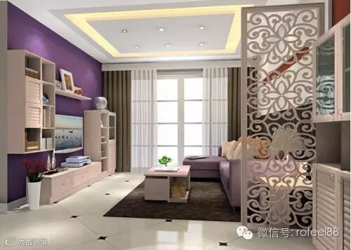 客餐厅的设计感很强烈,使用屏风之类的装饰性家具来进行隔断是非常不错的,不过这不能随便摆放,这个空间的镂空雕花设计非常好看,电视背景墙的主色调是非常高贵的,紫色的设计和粉色的柜体搭配在一起,看上去淡雅而温暖。