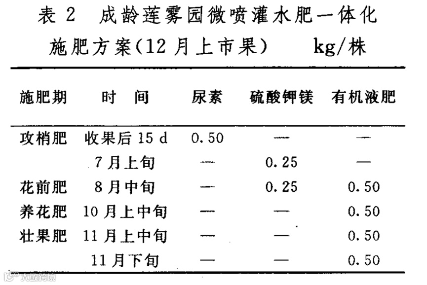 施肥采用传统施肥与微喷灌施肥结合的模式,即土施有机肥和部分化肥作为基肥,追肥则通过水肥一体化系统进行施用。水肥一体化微喷灌系统要求肥料具有较好的水溶性。具体而言,包括化学肥料、水溶性配方肥料及沤腐后的有机肥液。微肥一般选择螯合态微量元素,可通过叶面喷施与喷农药一起进行,也可通过加入灌溉系统施入根部。