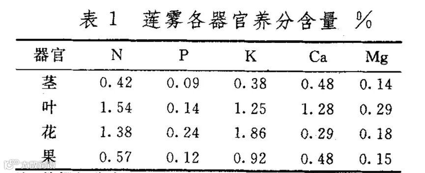 莲雾是热带常绿乔木,生长迅速、枝梢修剪量大,果实产量高,为喜肥果树。矿质养分元素在莲雾叶片中含量较高,在茎中含量较低。其中N、Ca、Mg在叶片中含量最高,P、K在花中含量最高(见表1),成熟果实中N、P、K三者比例为1:0.21:1.61。相较于其他热带作物,莲雾叶含P、N较高,其含磷量高于大部分热带作物(大部分热带作物纯P含量8~15mg/kg),其含氮量与香蕉相近。其K、Ca含量在热带果树中属中等水平。