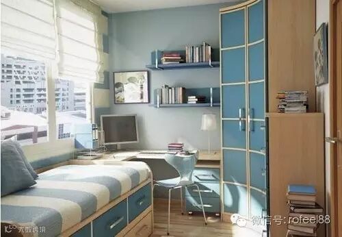 简单的蓝色小卧室,墙壁上的淡蓝色、家具用品的蓝色表面,装饰出一款非常清新的卧室,淡蓝的的墙面能够让人的视线更加的延伸。一些小小的装饰品,可以随自己的喜好选择艳丽的色彩,突出不一样的效果。