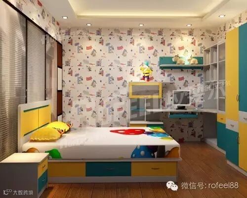 孩子的卧房在柠檬黄色与蓝色的映衬下,尤显活泼童真。床的高度稍高,书柜与衣柜的组合式的设计,将休息与学习融为一体,合理且实用。