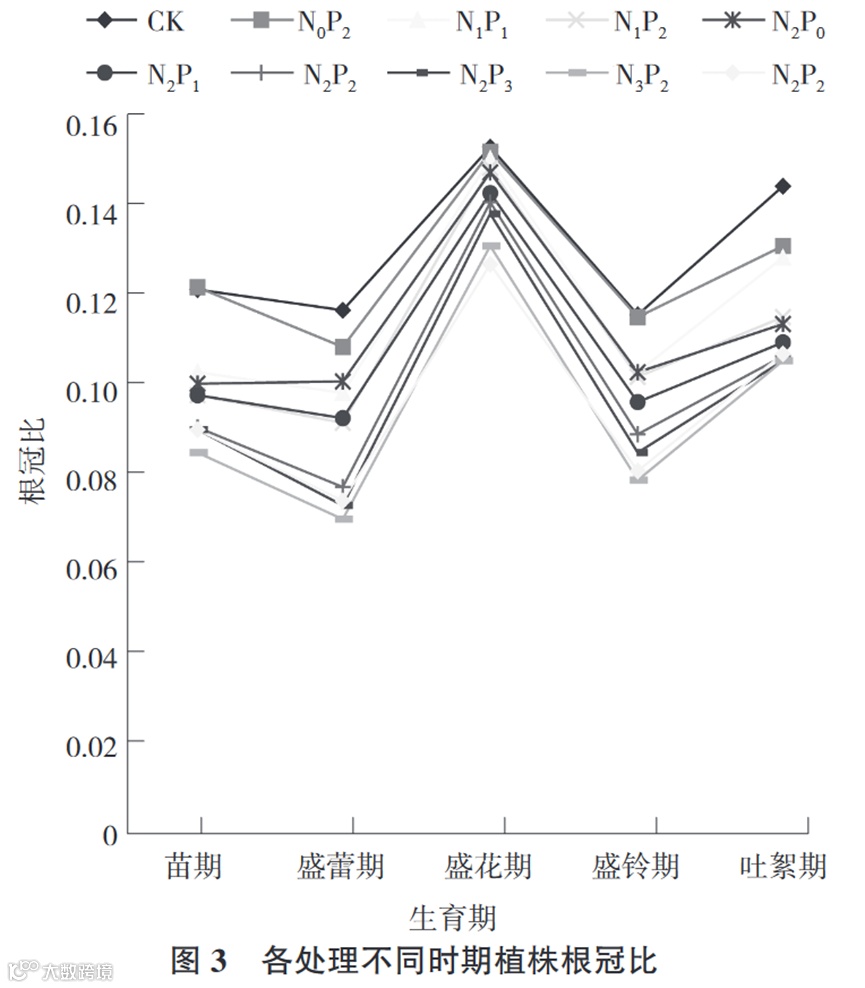 说明增施氮肥对植株根冠比影响明显,使根冠比减小;增施磷肥同样对植株根冠比有影响,但不明显。