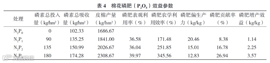 由表4可知,施磷可以增加棉花产量,增大棉花磷肥效益参数,其中处理N2P1、N2P2、N2P3的磷肥表观利用率、磷肥农学利用效率、磷肥偏生产力、磷肥料贡献率以及磷肥增产效益均比处理N2P0高,磷肥表观利用率依次为N2P3>N2P1>N2P2>N2P0,磷肥农学利用效率依次为N2P3>N2P2>N2P1>N2P0,磷肥偏生产力依次为N2P1>N2P2>N2P3>N2P0,磷肥贡献率依次为N2P3>N2P2>N2P1>N2P0,磷肥增产效益依次为N2P3>N2P2>N2P1>N2P0。