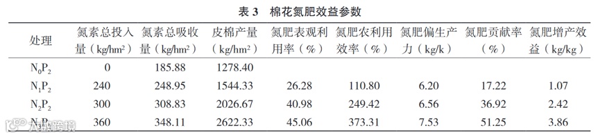 本试验结果(表3)表明,施氮可以增加棉花产量,增大棉花氮肥效益参数,其中处理N1P2、N2P2、N3P2的氮肥表观利用率、氮肥农学利用效率、氮肥偏生产力、氮肥料贡献率以及氮肥增产效益均比处理N0P2高,均表现为N3P2>N2P2>N1P2>N0P2。