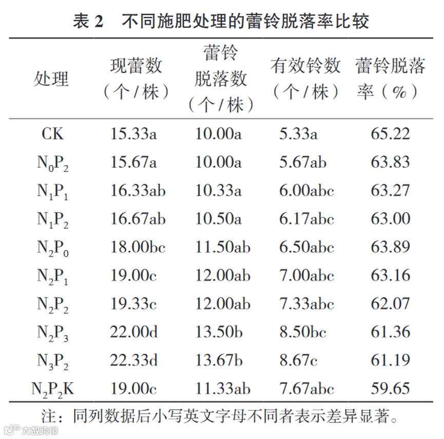 不同施磷量比较,处理N2P3棉花蕾铃脱落率比处理N2P0、N2P1和N2P2分别降低2.53%、1.8%和0.71%,有效铃数分别提高2.0、1.5、1.77个/株;所有施肥处理中,以处理N3P2有效铃数最高,处理N2P2K2蕾铃脱落率最低,由此可见,施钾处理降低了棉花的蕾铃脱落率。