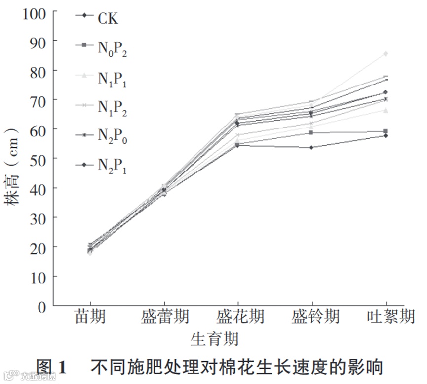 说明磷肥用量一定时,棉花生长速度在一定范围内随氮肥用量的增加呈增加趋势;氮肥用量一定时,随着磷肥用量的增加,各处理棉花生长速度也有所加快,但差异不显著。到了吐絮期,各施肥处理间棉株的高度都高于对照,且株高最大的处理为N2P2K2。