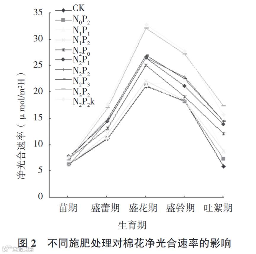 从苗期到盛铃期,以处理N2P2K的Pn最大,吐絮期则以处理N3P2的Pn最大。在棉花整个生育期,磷肥的不同施用量对棉花Pn的影响不明显。