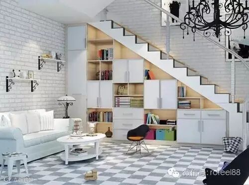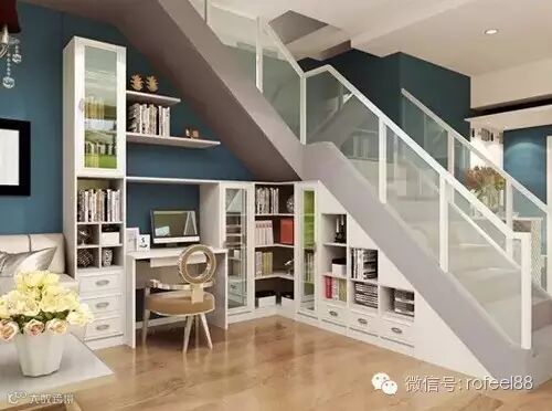 把楼梯和储物柜、书桌结合起来,将属于楼梯下的神奇空间有效利用起来。楼梯下多种排列组合的方案,不仅加大收纳空间,更用创意装点了您温馨的家。