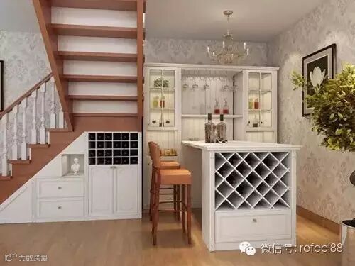 红樱桃做旧工艺,仿实木质感,特点鲜明,错落有致的方格,满足了储物和展示的需求。原木板材与白色楼梯相结合,简单明了,新颖独特。