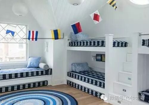 将不规则的阁楼改造成儿童房,奇怪的形状反而成了童趣天地的个性。蓝色与白色的搭配在夏日燥热的天气下,送来清凉的视觉感观。