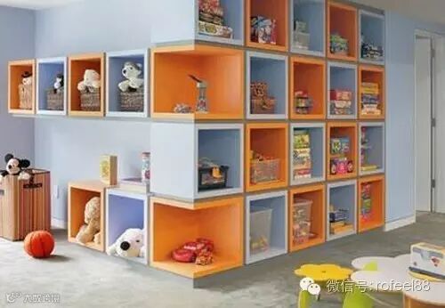 浅蓝与暖黄拼色的墙格,有序的收纳儿童房里的所有用具。在色彩明亮的房间里,让小公主从小学会收纳,保持室内的整洁干净。