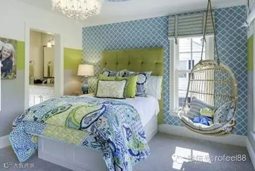简约的格子背景墙和花纹床上用品,让这间儿童房透露出大气的风范。墙角的一款吊椅,疲累时懒意洋洋的悠闲晃荡。