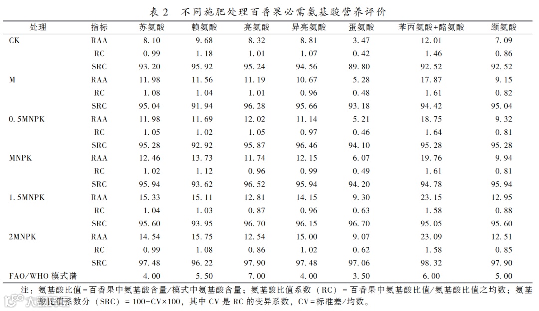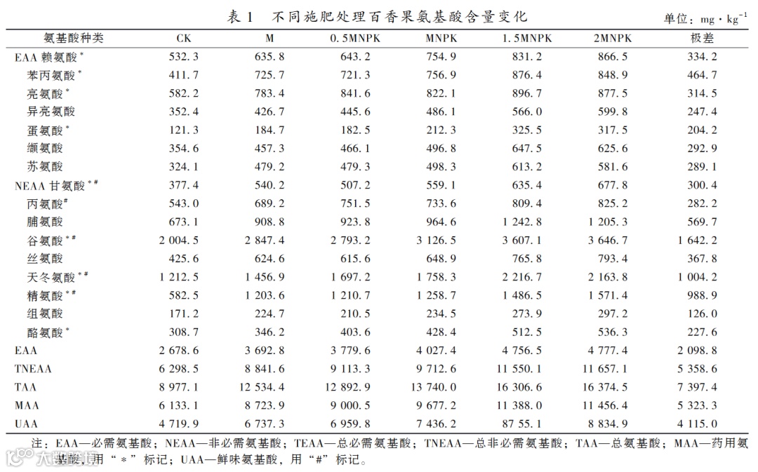文案 | 来源 彭熙,张丽敏,李安定,等. 施肥对百香果氨基酸的组分影响及营养评价[J]. 浙江农业科学,2023,64(4):881-885.
