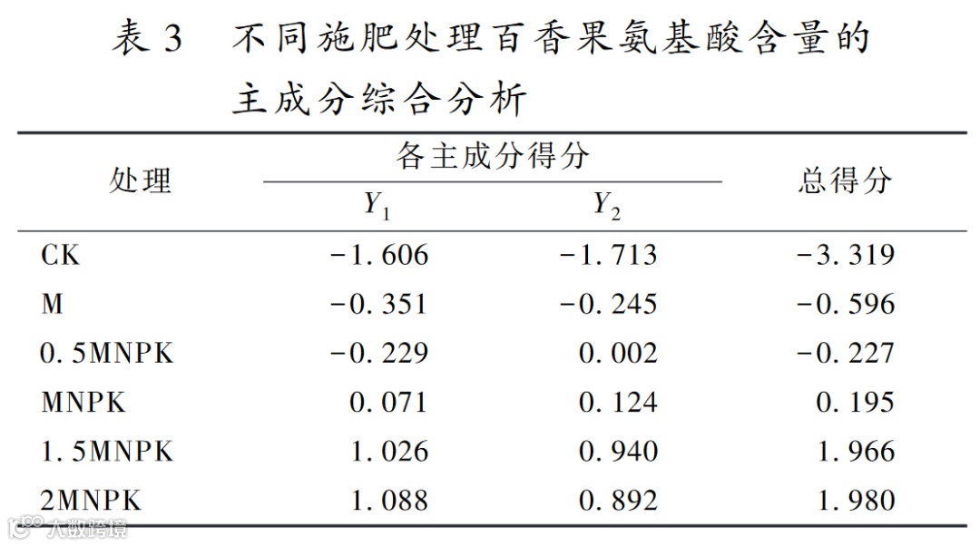 根据该模型计算出不同施肥处理的综合总得分,分值越高,说明该种施肥处理百香果氨基酸品质越好。从表3可看出,2MNPK的总得分最高,为1.98,而1.5MNPK的总得分与2MNPK相当,为1.97,CK的得分最低,为-3.32,排序为2MNPK(1.98)=1.5MNPK(1.97)>MNPK(0.20)>0.5MNPK(-0.23)>M(-0.60)>CK(-3.32)。由此说明,2MNPK和1.5MNPK施肥处理下,百香果氨基酸品质相当,且远远优于其他施肥水平。