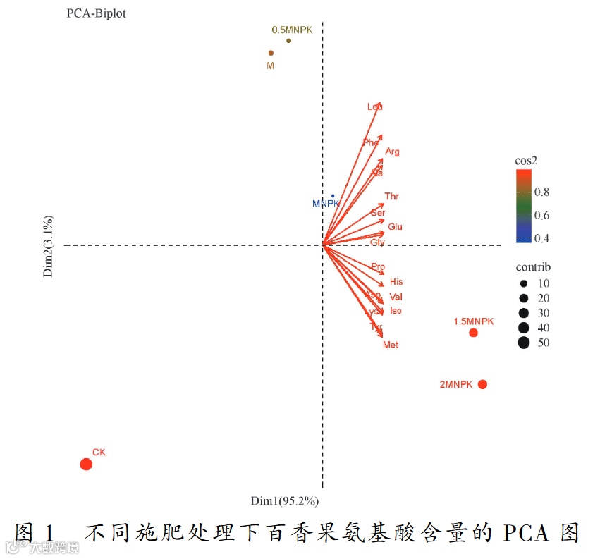 2. 通过氨基酸比值系数法分析,蛋氨酸和缬氨酸为限制氨基酸,苯丙氨酸和酪氨酸过剩,苏氨酸、赖氨酸和异亮氨酸与模式蛋白相当,2MNPK处理的氨基酸营养价值最丰富。主成分分析显示,2MNPK和1.5MNPK处理的氨基酸品质得分最高。