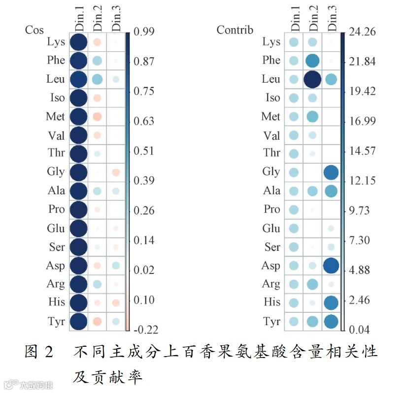 在图1和图2中,以特征值大于1为标准,在检测的16个指标中共提取出2个主成分,累积解释贡献率为98.25%,说明这2个主成分基本反映了原始变量的全部信息,可代替原16个指标评价百香果的氨基酸品质。