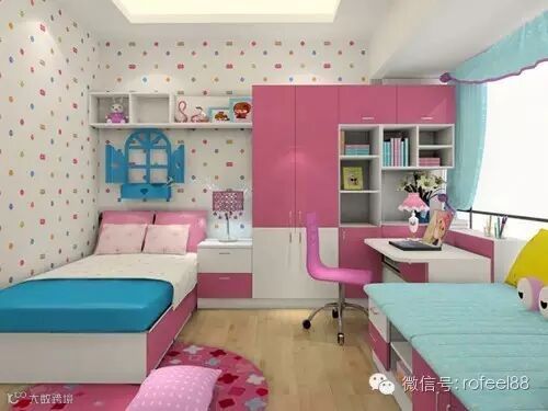 这个是大约10平米的常见空间,家具柜子的设计主要以粉白色搭配设计为主,背景用墙纸装饰一下让整个空间变的时尚美观。空间加以设计榻榻米储物地柜,不仅可以给小孩多一个玩耍的位置也可增加储物收藏。