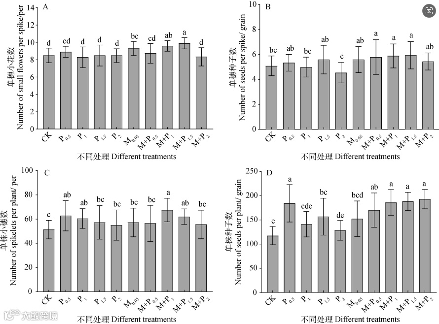 同时,M+P1处理对单株小穗数的增加最为显著,提高了31.39%,而M+P1.5、M+P2处理对单株种子数的增加效果显著,最高增加了64.37%。
