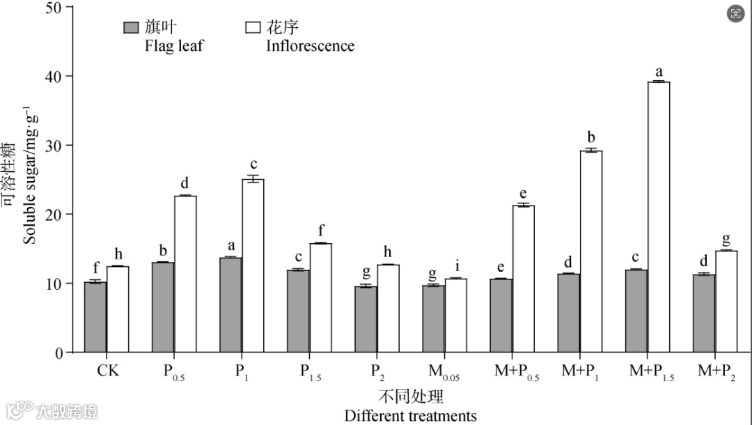 与CK相比(图4),Mn+γ-PGA处理组中,旗叶、花序可溶性糖含量先上升后下降变化趋势,与CK存在显著差异(P<0.05),特别是在M+P1.5处理,其旗叶、花序可溶性糖含量达到峰值,相比CK分别提高了16.91%和214.46%。