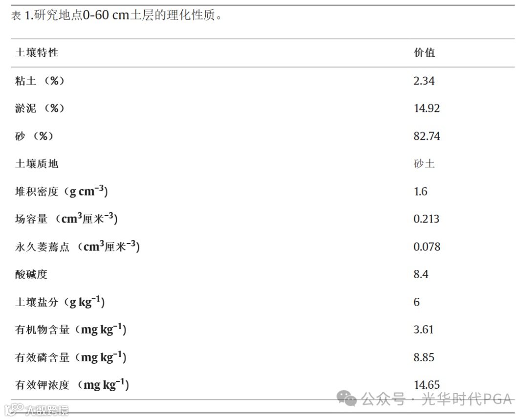 实验处理包括五种γ-PGA施用量(0、20、40、80和160 kg/ha),分别标记为CK、P20、P40、P80和P160。每个处理有 3 个重复,随机分布在 15 个样地中。实验地点年平均降水量小于80毫米,但年平均潜在蒸发量大于2700毫米。实验田表土(0-60 cm)的理化性质简述见表1。