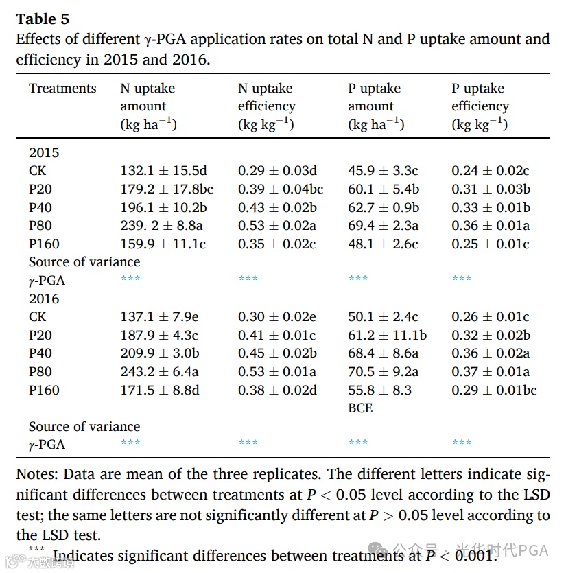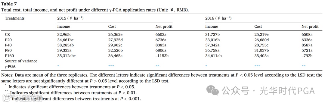 考虑到养分吸收效率、水肥生产率和农民净利润,我们建议 65 公斤/公顷可作为提高农业生产和经济效益的适当γ-PGA应用策略。