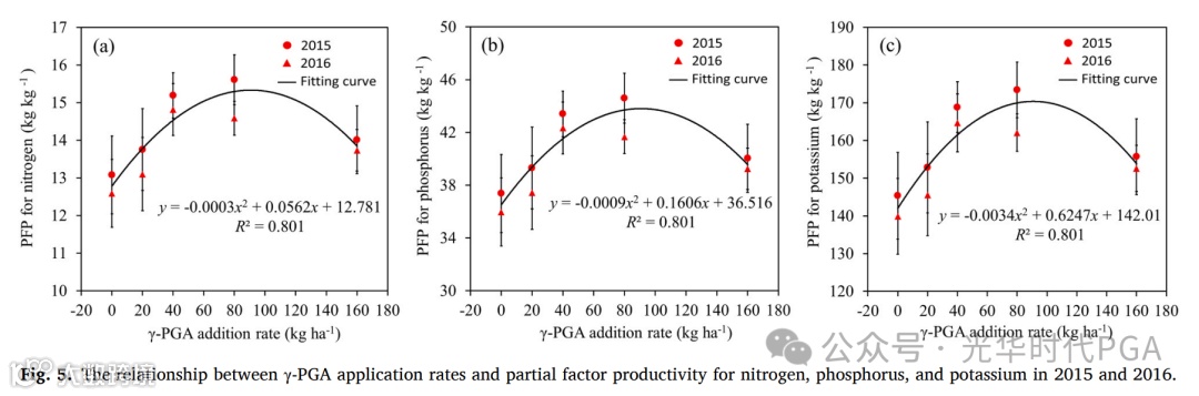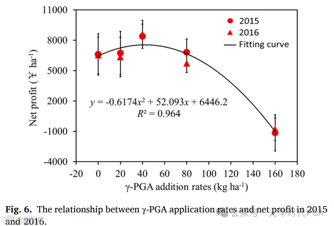 此外,γ-PGA应用率与净利润之间的关系也通过二次曲线拟合(图6)。根据二次函数分析,当γ-PGA施用量为42.1 kg ha时,净利润最高,在综合考虑养分(氮和磷)吸收效率、水肥生产力和净利润的基础上,我们建议65公斤/公顷可以作为适当的γ-PGA应用速率。