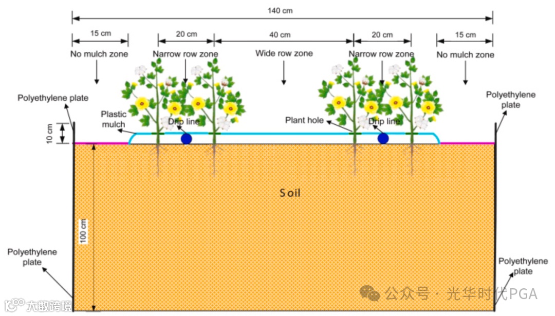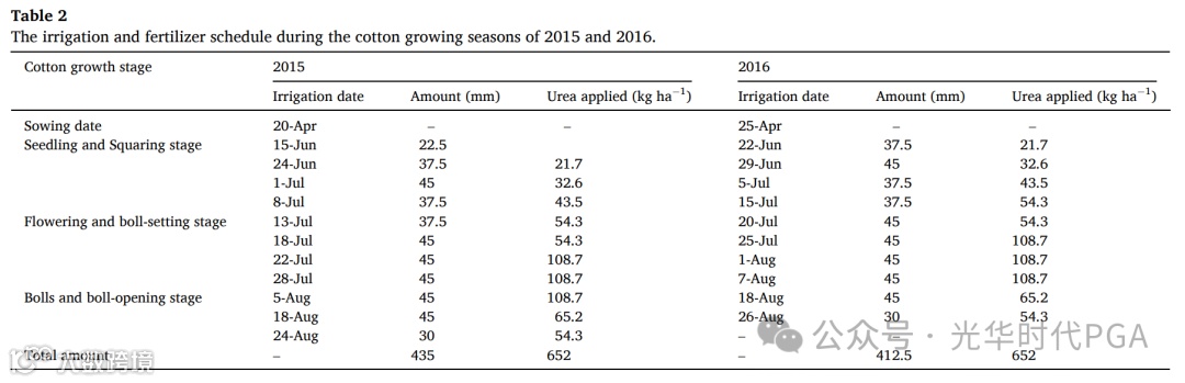 棉花是试验区的主要经济作物。棉花种植模式和滴灌线布置为图1中的“1个覆盖物、2个滴灌线和4行棉花植株”。为了满足棉花植物的养分需求,450公斤/公顷犁耕前施用有机肥(有机质含量≥45%)作为基础肥料。在生长季节,652 公斤/公顷尿素, 228 kg/ha磷酸二铵和 52 公斤/公顷在每个地块中施用硫酸钾。灌溉水来自地下水,地下水被归类为微咸水,电导率为2.8―3.1 mS/cm。在两个生长季节,灌溉时间表中显示了每次灌溉事件的灌溉日期和灌溉量(表2)。每个地块的灌溉计划是相同的。