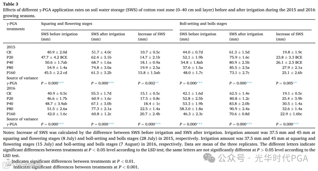 在两个生长季中,灌溉后的SWS显著高于灌溉前。在两个生长季节,所有实验处理的灌溉量相同。γ-PGA处理根区SWS的增加显著高于CK<0.05(表3)。γ-PGA可以有效提高土壤持水能力,提高SWS,这意味着γ-PGA在农业生产中具有巨大的节水潜力。