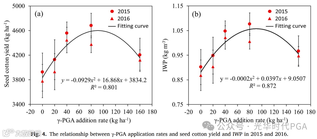 根据上述结果,我们发现过量的γ-PGA施用量并没有像预期的那样提高养分(氮和磷)吸收效率、水肥生产力和经济效益。γ-PGA施用量与氮磷吸收效率之间的关系通过二次曲线拟合(图3a和b)。根据两个二次函数,当最佳γ-PGA施用量分别为79和83.3 kg/ha时,氮和磷的吸收效率最高,γ-PGA施用量与水肥生产率(籽棉产量、IWP和肥料PFP(N、P和K))之间的关系采用二次曲线拟合(图4、图5)。通过对这些二次函数的分析,计算γ-PGA应用平均值(89 kg ha)可以实现最高的养分(氮和磷)吸收效率和水肥生产力。