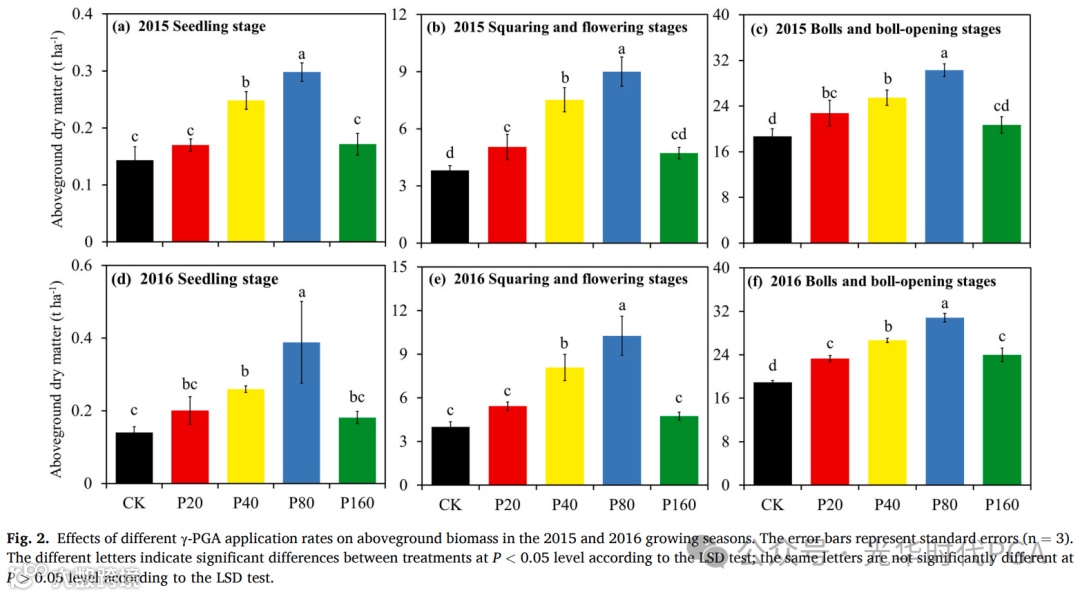 从籽棉产量、IWP 和肥料的 PFP(N、P 和 K)等方面评估了棉花的水肥生产率(表 6)。与CK相比,γ-PGA处理显著提高了籽棉产量、IWP和肥料PFP(<n、p和k)。然而,2015年p80处理和2016年p40处理的籽棉产量和iwp最高,肥料pfp最大(n、p和k)。这表明过量施用γ-PGA并没有像预期的那样提高棉花的水肥生产力。