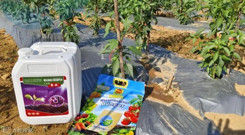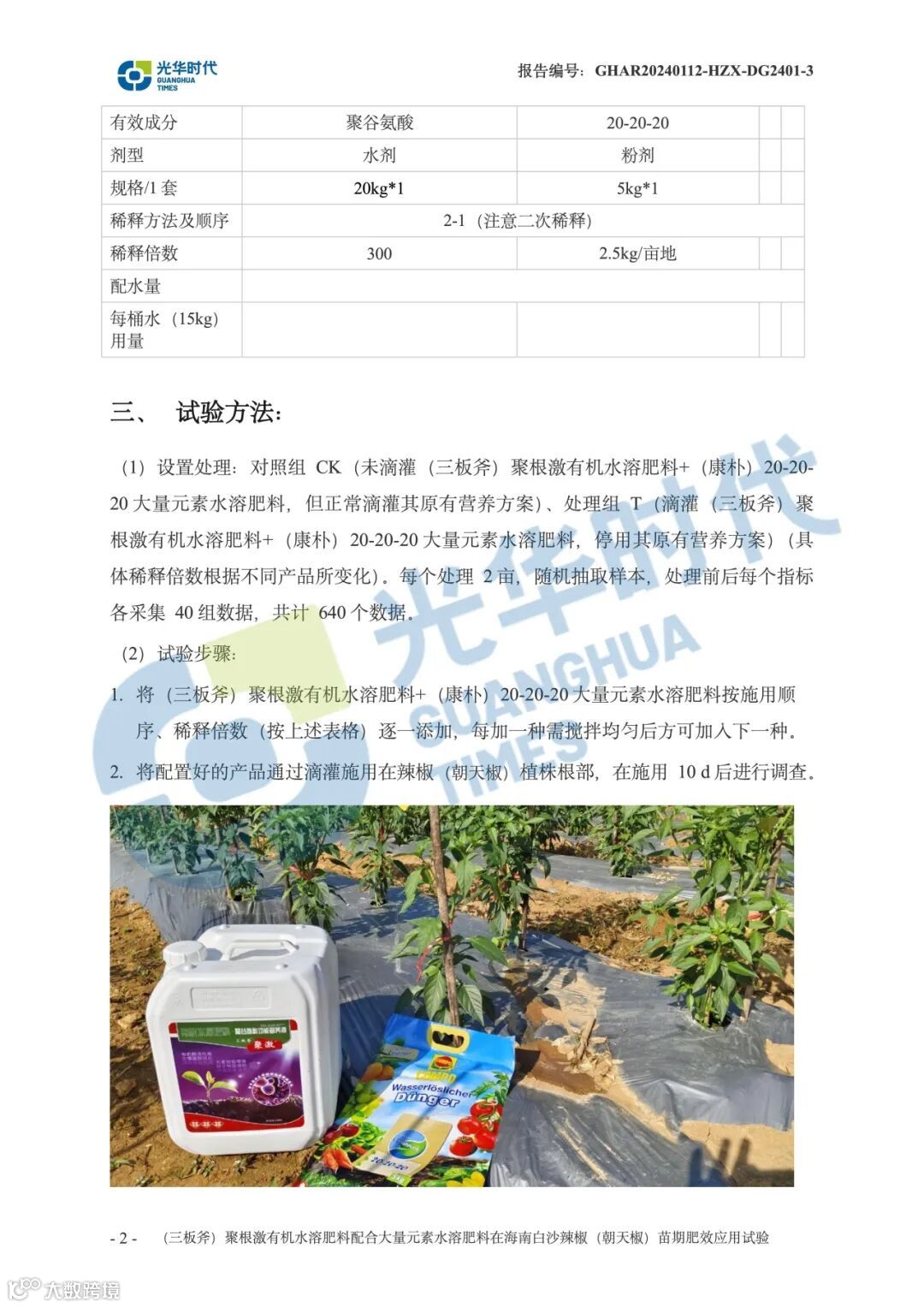 使用(三板斧)聚根激有机水溶肥料配合大量元素水溶肥料(康朴20-20-20)营养方案,在辣椒(朝天椒)苗期施用,以测试(三板斧)聚根激有机水溶肥料的复配性效用。