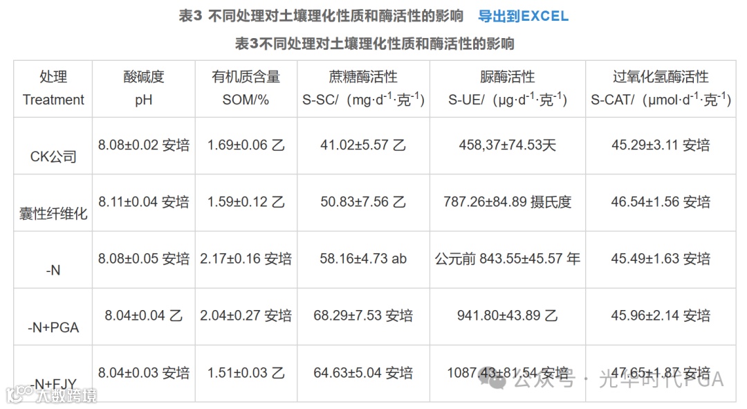 由表3可知,-N+PGA和-N+FJY处理下土壤pH值最低,显著低于CF处理(P<0.05),CK、-N与CF处理相比pH值未见明显变化。土壤有机质(SOM)与土壤肥力密切相关,通常呈正相关性;-N和-N+PGA处理显著提高了收获季土壤有机质(SOM)含量,而CF处理低于CK处理,证明了大量单施化肥会导致有机质降低这一结论(表2)。