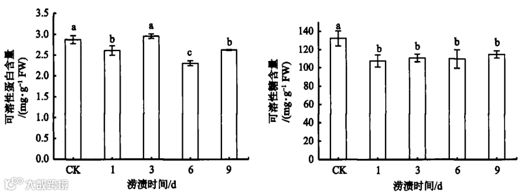 涝渍胁迫1d,可溶性蛋白含量明显下降,并显著低于对照组。