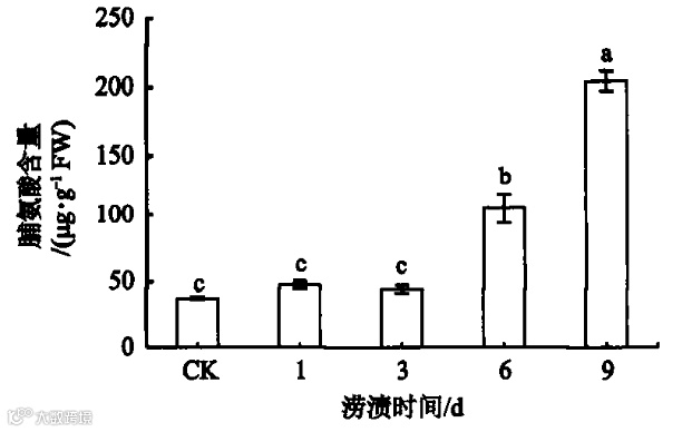 涝渍胁迫6d和9d的脯氨酸含量分别比对照组增加1.83倍和4.49倍,均显著高于对照组。