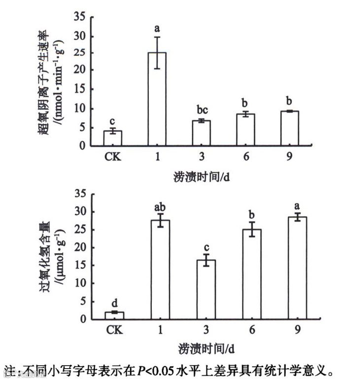 图2涝渍胁迫对胡椒扦插苗叶片超氧阴离子产生速率和过氧化氢含量的影响
