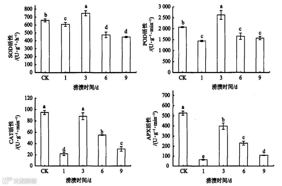 图4涝渍胁迫对胡椒扦插苗叶片中SOD、POD、CAT、APX活性的影响