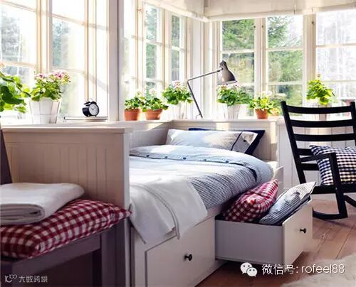 阳台装修成了一个简单的休闲区,可以躺在小床上沐浴着午间阳光休憩,也可以捧一本书籍在摇椅上享受下午茶时光。满窗的小绿植和窗户绿景遥相呼应。