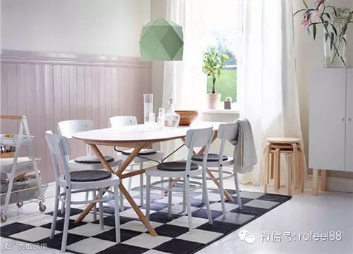 餐厅以几何简约拼凑出图形的个性美感,除了桌椅之外收纳便捷的小凳可以随时扩展餐厅的容量。
