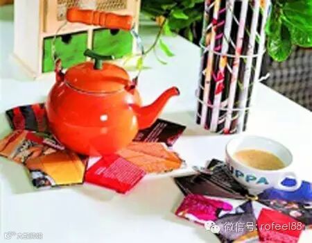 锅垫和盘子垫非常容易弄脏,不论什么材质脏了之后都难清洗。干脆使用废旧的报纸,像叠纸鹤那样,先叠成若干个菱形块,然后用订书钉或者双面胶拼接在一起,就做成了一次性的锅垫和盘子垫。用塑料饮料瓶制成的餐具笼也可以用报纸装饰一下,把报纸搓成小卷,然后依次贴在瓶子上,最后用漂亮的绳子装饰一下即可。